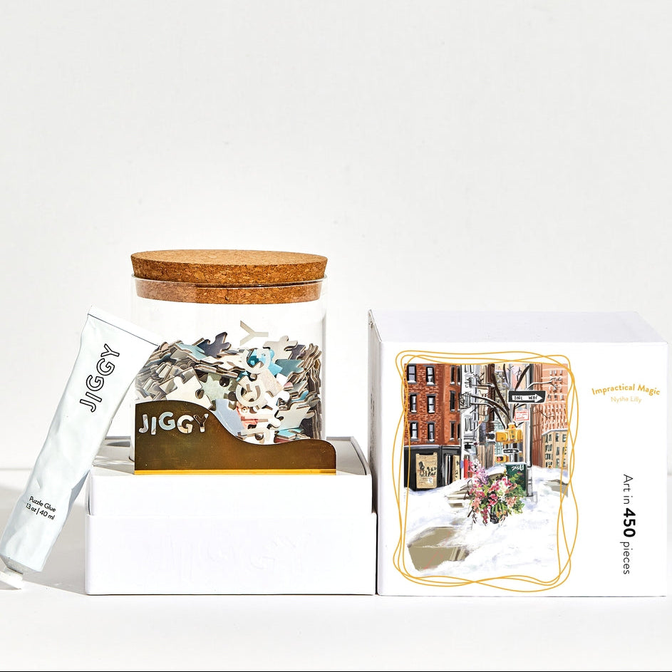 Each JIGGY puzzle comes in a reusable glass jar and includes a tube of puzzle glue, a straight-edge tool to spread the glue and a print of the art to follow.