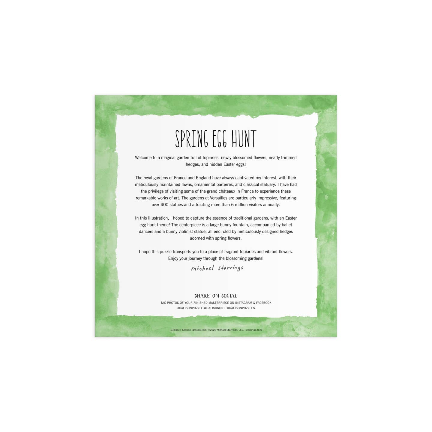 Step into a magical formal garden with this 500-piece puzzle by Michael Storrings. Inspired by the classical gardens of Europe, the illustration features meticulously manicured hedges, spring blooms, and ornamental topiaries framing a whimsical Easter celebration. A bunny fountain anchors the scene, surrounded by graceful statuary and hidden eggs throughout the composition. Storrings captures the elegance of traditional garden design infused with festive charm, creating an engaging puzzle that rewards careful observation and celebrates the beauty of spring.