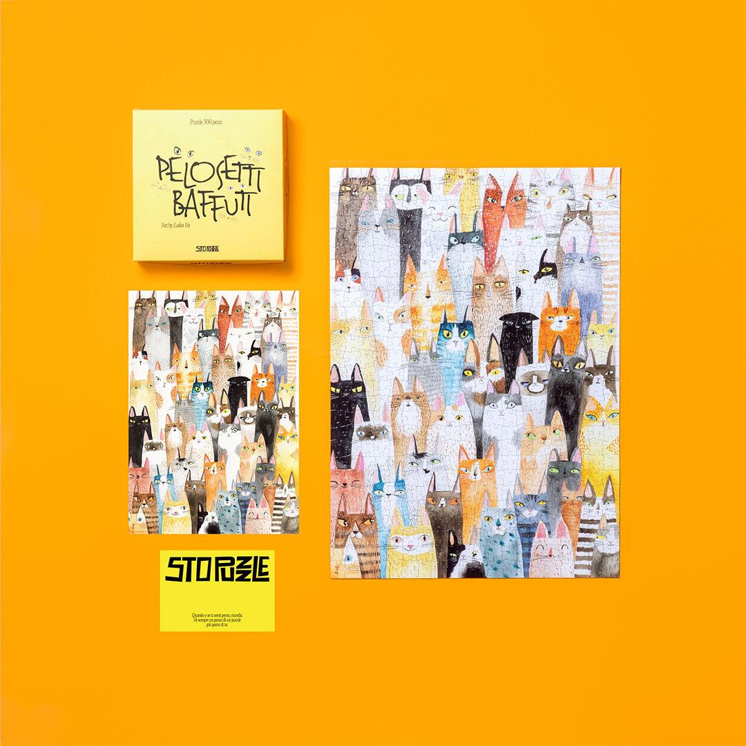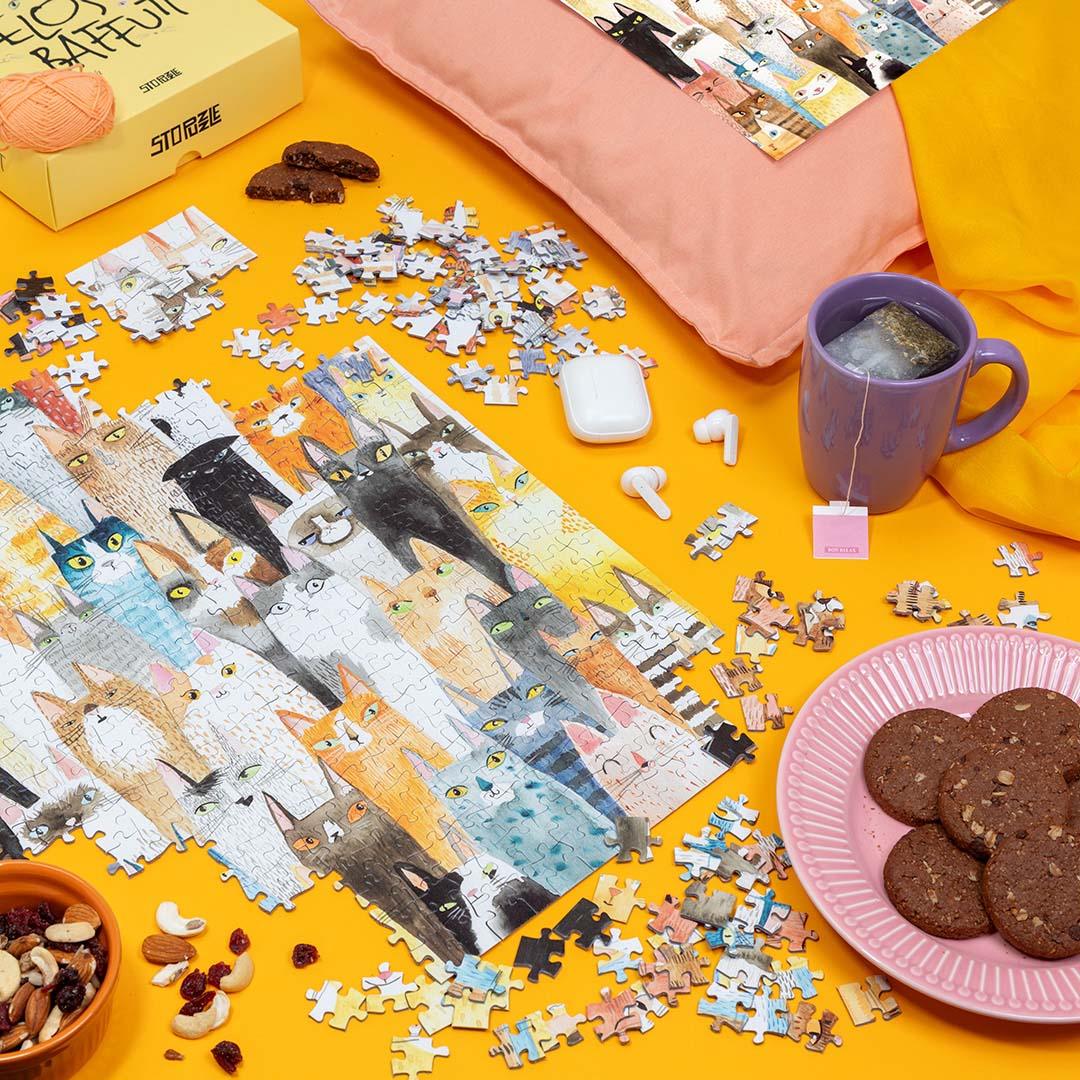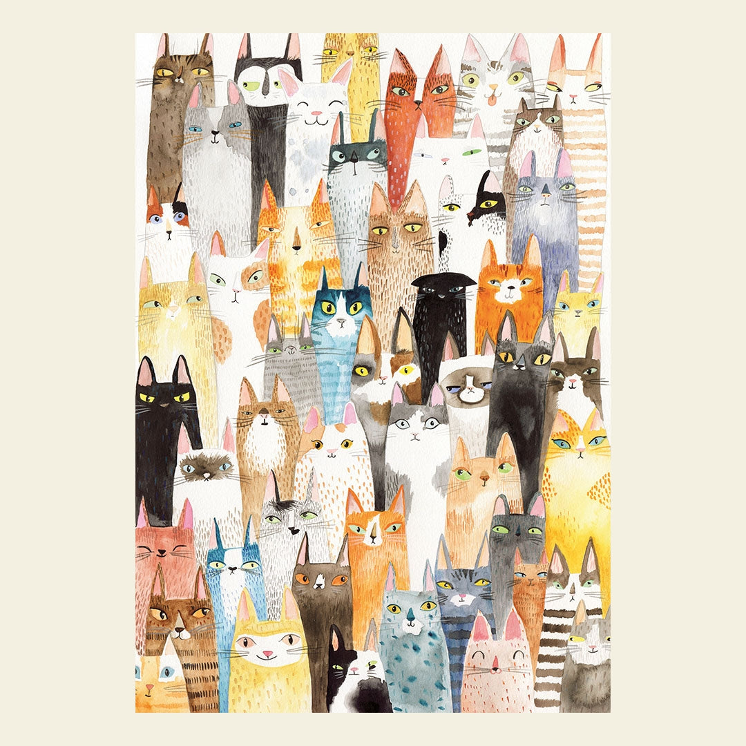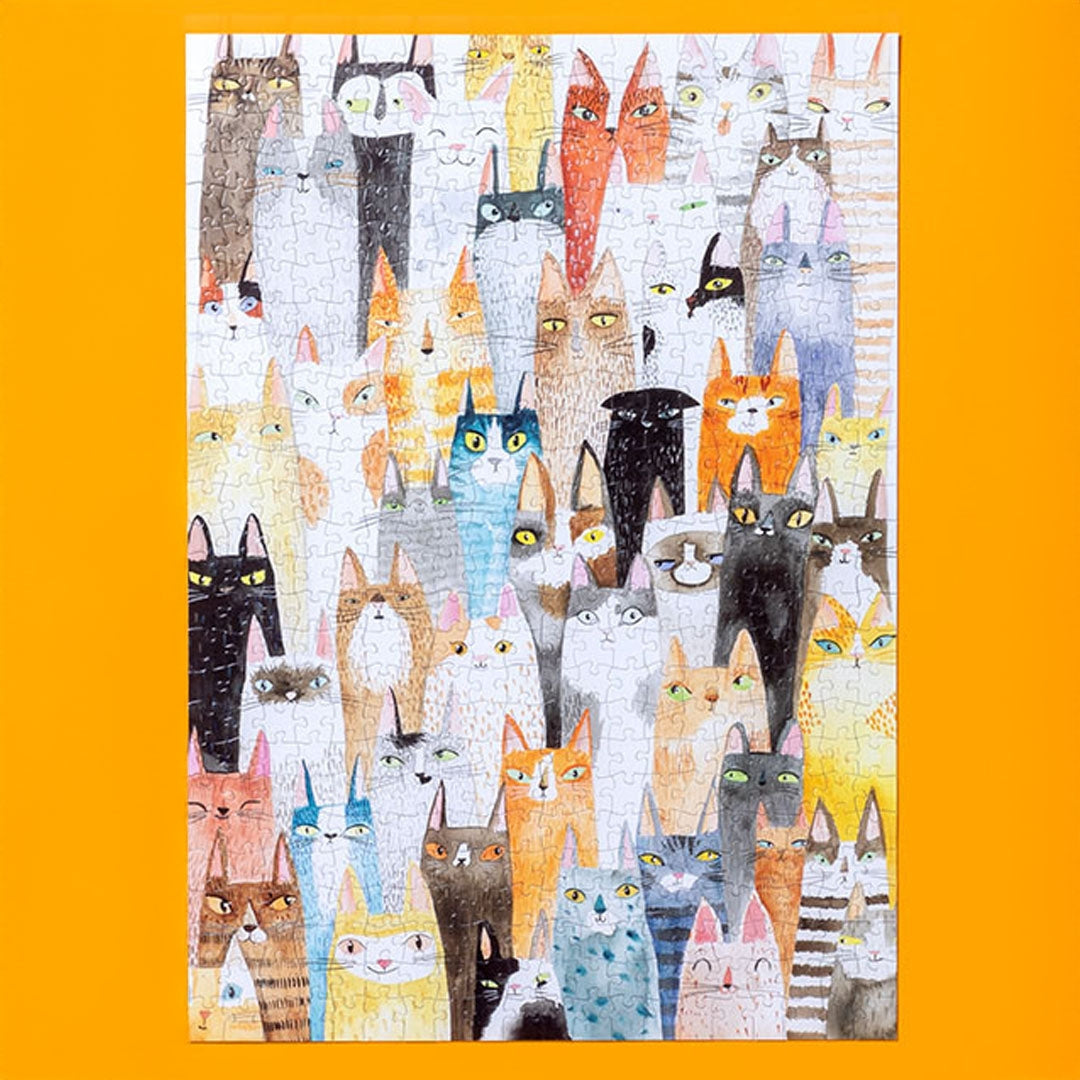 This cat puzzle named "Whiskered Furries" is our best-selling 500-piece puzzle designed by New Zealand artist Luka Va.