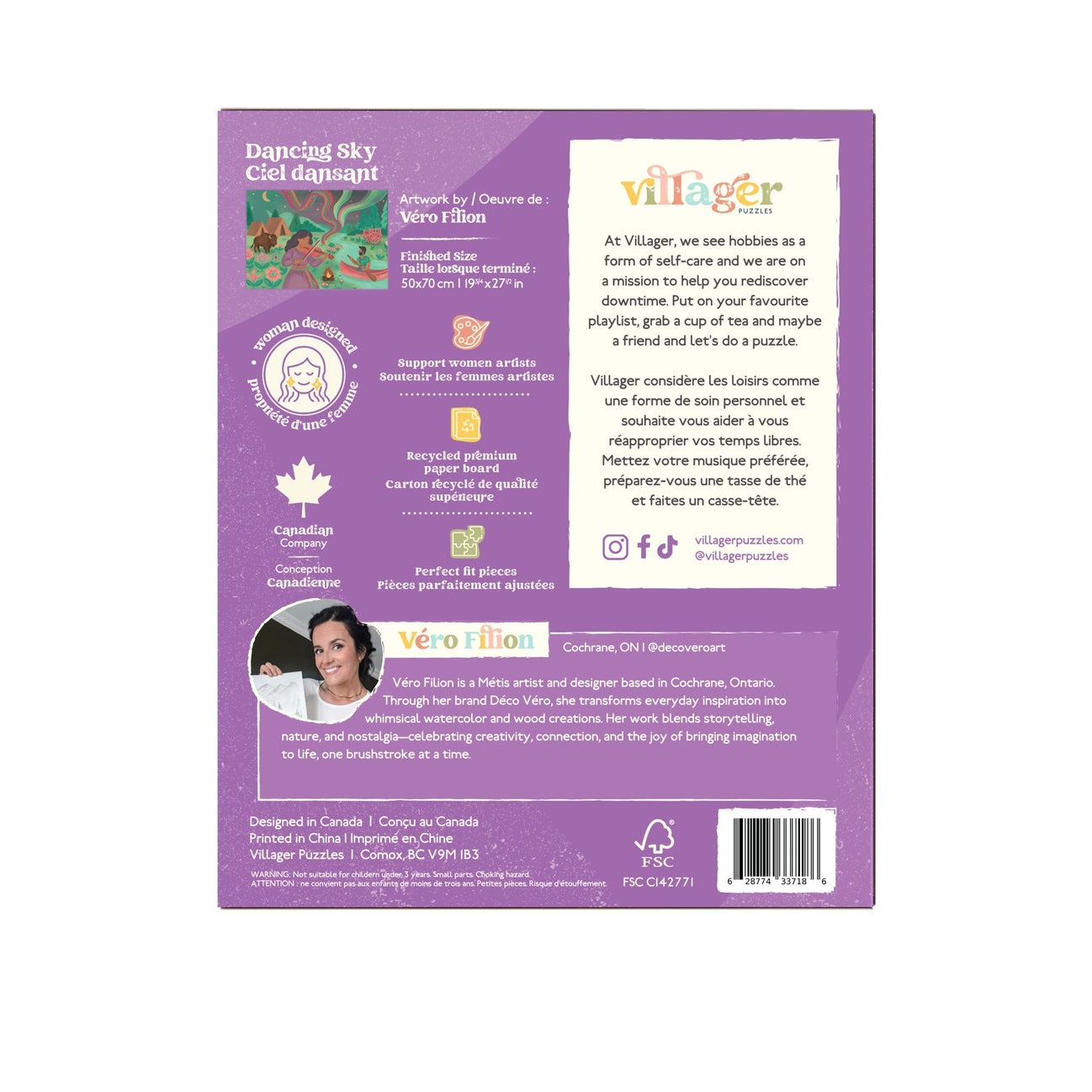 Inspired by Métis culture, this richly detailed scene was created by artist Cochrane, Ontario, Véro Filion, for the 2026 Villager Puzzles Call for Art. A fiddler plays near a riverside settlement as a paddler drifts by, alongside a bison, a Red River cart, and florals inspired by Métis beadwork, each symbolizing belonging and connection to the land. As the music rises, flowing Métis sashes become the northern lights, carrying culture between earth and spirit, past and present.