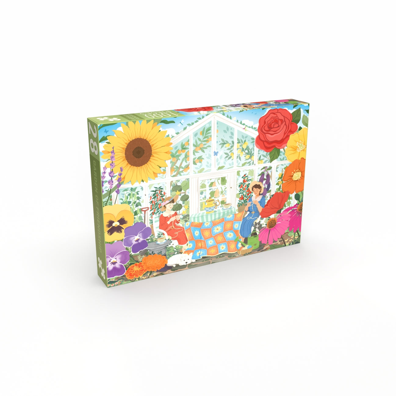 The jigsaw puzzle Garden of Friendship is a tribute to friendship and the quiet moments we share with one another. In front of the large greenhouse, 2 friends sit side by side knitting on the same blanket - a symbol of closeness, togetherness and time allowed to move at its own gentle pace. Experience how this puzzle calms you down with the oversize flowers, lush greenery and a vibrant life in a dreamlike setting for those moments that, piece by piece, form bonds that grow stronger when we create something together.