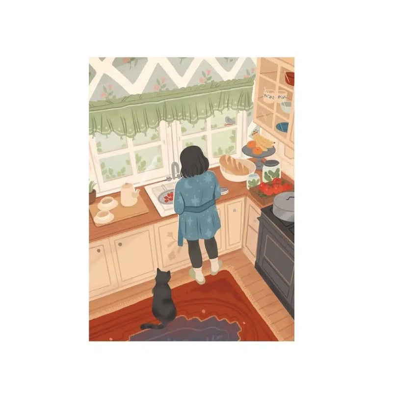 The mini puzzle Waiting For Lunch by Trevell is a mini puzzle consisting of 99 pieces. Illustrated by Nicolle Lalonde, a woman prepares the meal under the watchful eye of her cat, who observes every movement with curiosity, adding a touch of complicity to this daily moment.