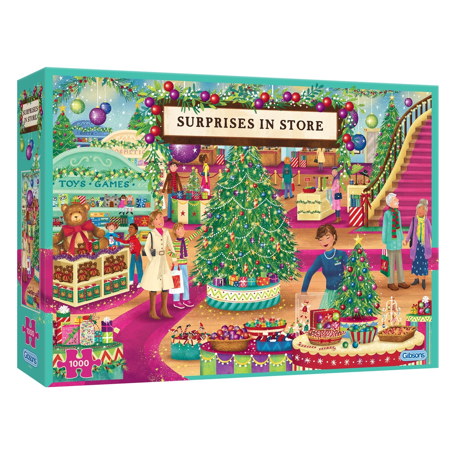 Do your Christmas shopping in style with this beautiful 1000 piece jigsaw puzzle from Claire McElfatrick. With twinkling lights and shiny baubles everywhere, cheerful shoppers are wandering around in search of that special gift. This wonderfully festive department store is exactly where you should go to pick up your Christmas shopping.