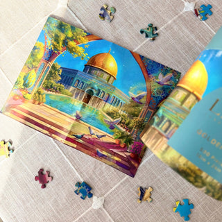 A Laila Luxury Puzzles Golden Dome 500-piece jigsaw puzzle sits on a table beside a Palestine puzzle guide with a dome illustration, surrounded by loose pieces from the Ola El-Metwally design.