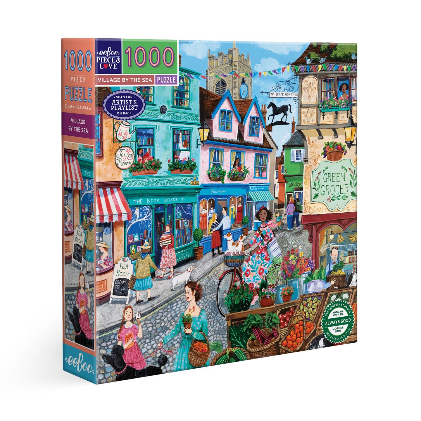 Artist Stephanie Lambourne’s cheerful lane of shops introduces a charming seaside town bustling with cheerful patrons enjoying tea, shopping for books, groceries, and other local goodies.