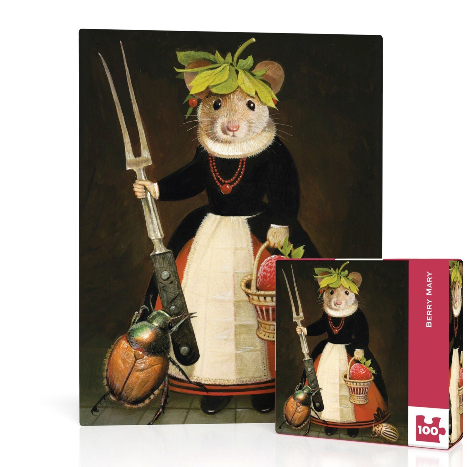 Step into a world of surreal charm with Berry Mary, a 100 piece mini puzzle featuring the imaginative artwork of Bill Mayer. This quirky and captivating scene stars an anthropomorphic mouse elegantly dressed in a black velvet gown and apron, holding a two-pronged fork and presenting a single, perfectly ripe strawberry in her basket. Flanked by two striking scarab beetles, Berry Mary blends whimsy, detail, and dark humor in a composition that’s as curious as it is delightful. Ideal for fans of eccentric art, collectors, and puzzle enthusiasts, this compact puzzle offers a bite-sized challenge with big personality.