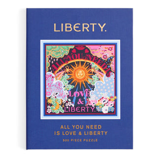 A blue Galison box holds the “All You Need Is Love & Liberty” 500-piece jigsaw puzzle, featuring colorful artwork on recycled paper, with several loose pieces displayed in front.