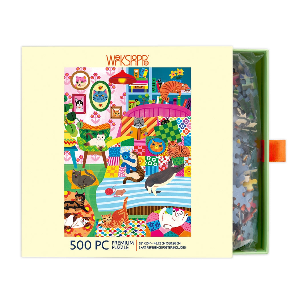 Cat Nap Stories brings a cozy, colorful world to life, filled with cats of every shape and shade settling in for the perfect snooze. The quirky bedroom scene is packed with playful patterns, whimsical decor, and tiny details that make the puzzle feel warm and lived-in. It's a vibrant, feel-good challenge that keeps you smiling as you piece together every sleepy feline.