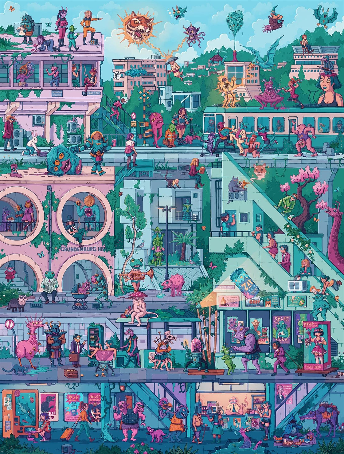 Explore the concrete jungle, brimmed with interesting and fantastical characters! Step into this diverse world and encounter an array of intriguing and surreal characters, from frog people wearing fancy suits to monsters with giant mushroom heads. Let your imagination run wild as you piece together this quirky and amusing jigsaw puzzle. You'll start to notice all of the intricate details as you get further along in this puzzling journey!