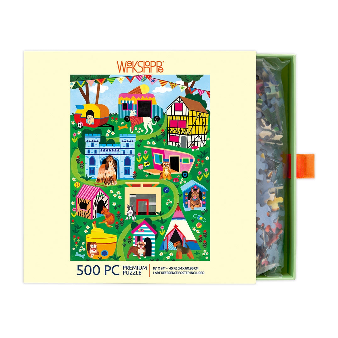 Dog lovers are going to lose it over this one. Doggie Dreamhouse is a bright, playful scene packed with pups living their absolute best lives in a neighborhood built just for them. Tiny dog cabins, colorful campers, a pup-sized castle, and plenty of wagging tails make this puzzle ridiculously charming from edge to edge. Every section feels like its own little story, so it stays fun the whole way through. At 500 pieces, it hits that sweet spot: enough challenge to stay engaging, but not so intense that you'll abandon it halfway. It's cheerful, detailed, and perfect for anyone who thinks a perfect afternoon involves dogs, color, and a little puzzle time.