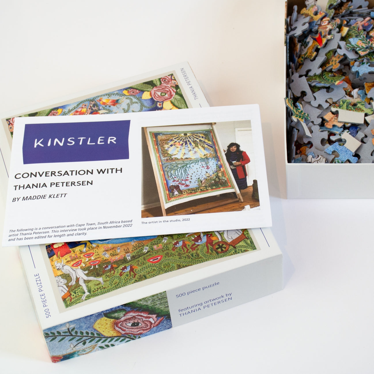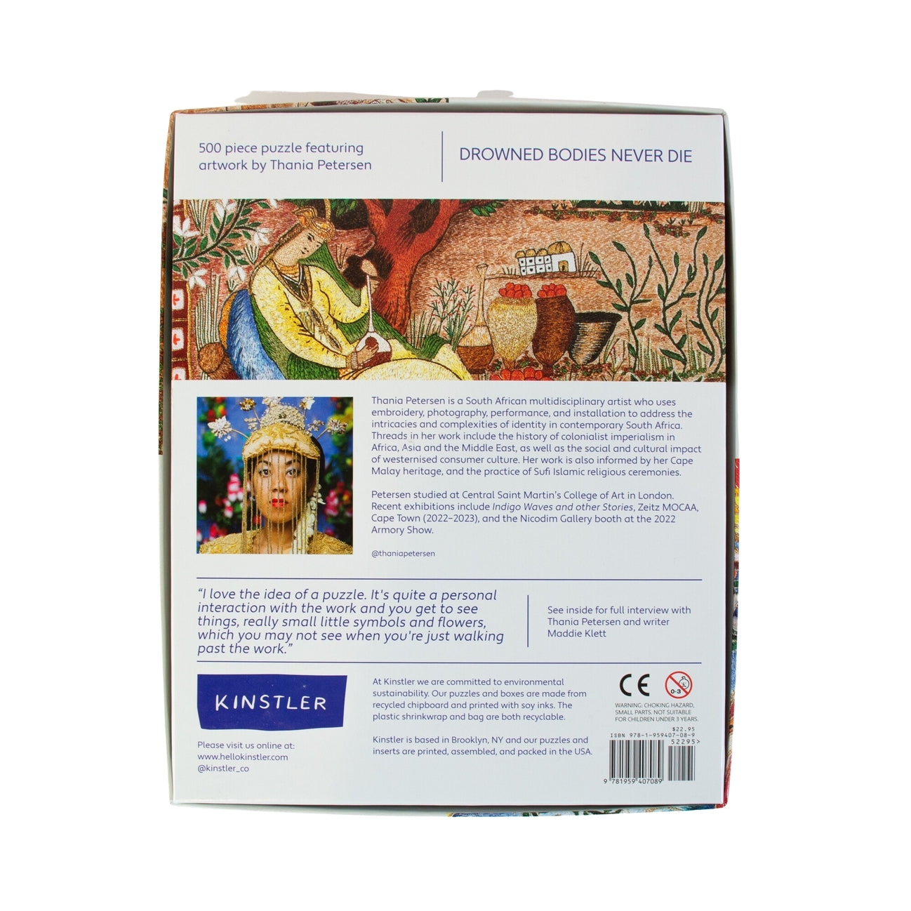 South African artist Thania Petersen can trace her lineage back to Tuan Guru, an Indonesian prince brought to South Africa by the Dutch in the 18th century. Fittingly, her work interrogates colonial histories and explores hybrid identities. Her dazzling embroideries, like this middle panel from her recent Drowned Bodies Never Die tryptic, fuse styles derived from history painting and textiles and provide both visual delight and subversive content through their rich symbolism. Included in the puzzle is an interview with Thania along with additional images of her most recent work.