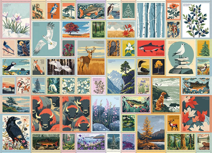 Emblems of Canada features the best of Canada's nature collaged together in stamp form. This 1000 piece puzzle was created by the design team at Cobble Hill.