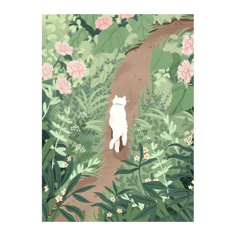 The Trevell Pathway mini puzzle is a mini puzzle consisting of 99 pieces. This mini puzzle depicts an adorable little white cat strolling along a green path, surrounded by beautiful colorful flowers. A scene full of softness and freshness. It is illustrated by Nicolle Lalonde.