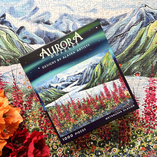 Aurora Puzzles' Matanuska Glacier | 1,000 Piece Jigsaw Puzzle showcases glacier artwork with vibrant flowers and loose pieces on a blue background. This eco-friendly puzzle comes in a sturdy box, perfect for Alaskan scenery lovers.