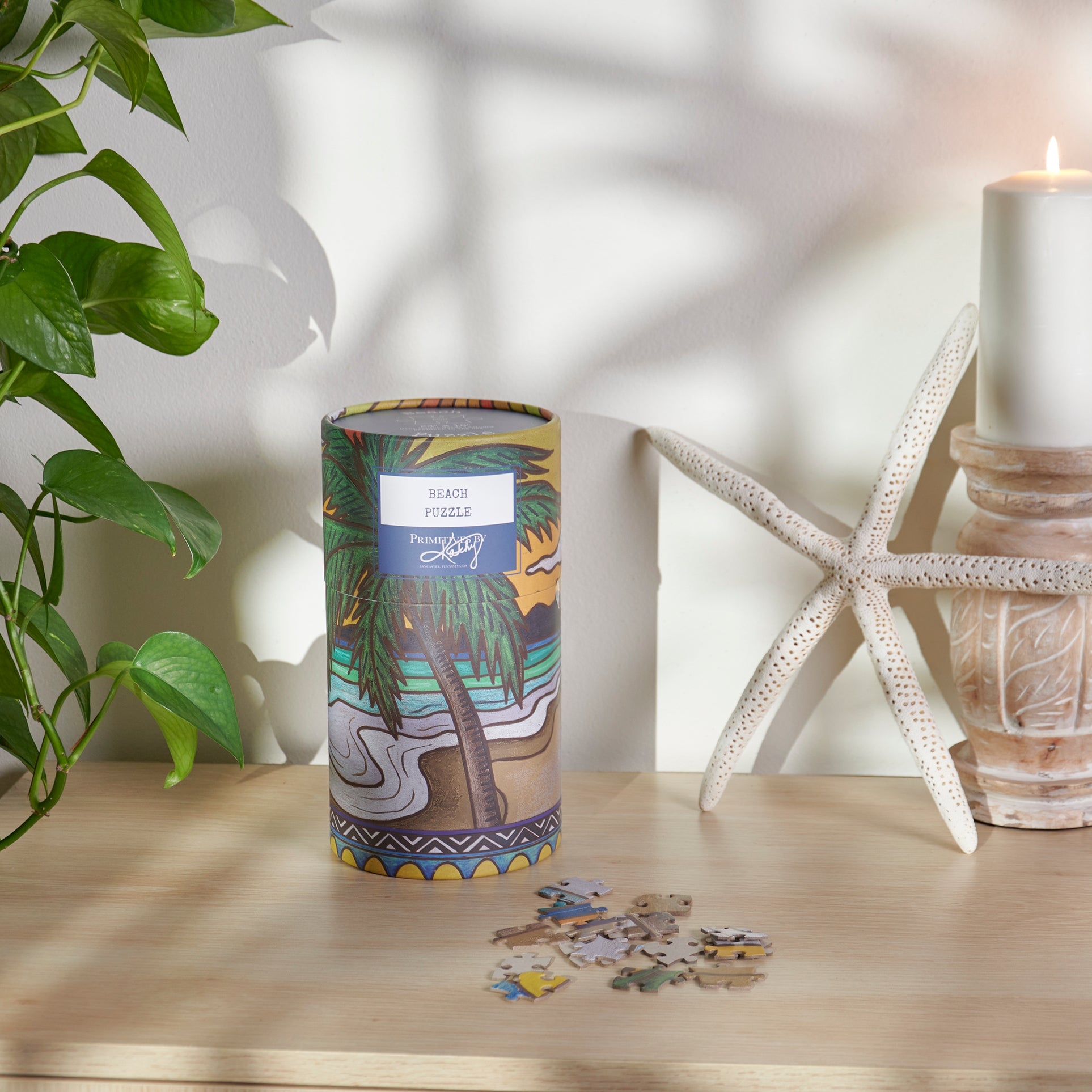 A 500 piece puzzle from our Beach Collection displaying a vibrant hand illustrated scene of beach and palm tree. Design is replicated from original wood burned art. Puzzle pieces are packaged in a resealable plastic bag and enclosed in a cylindrical box with the design displayed around outside and a descriptive "Beach Puzzle" sentiment on lid. Our Beach Days puzzle includes a printout of full puzzle image for reference.