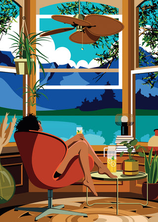 The Citron Pressé 1,000-piece jigsaw puzzle by Marie-Chantal features an illustrated woman relaxing with a drink in a mountain-view room on a green and white striped box. Velvet finish adds a luxurious touch.