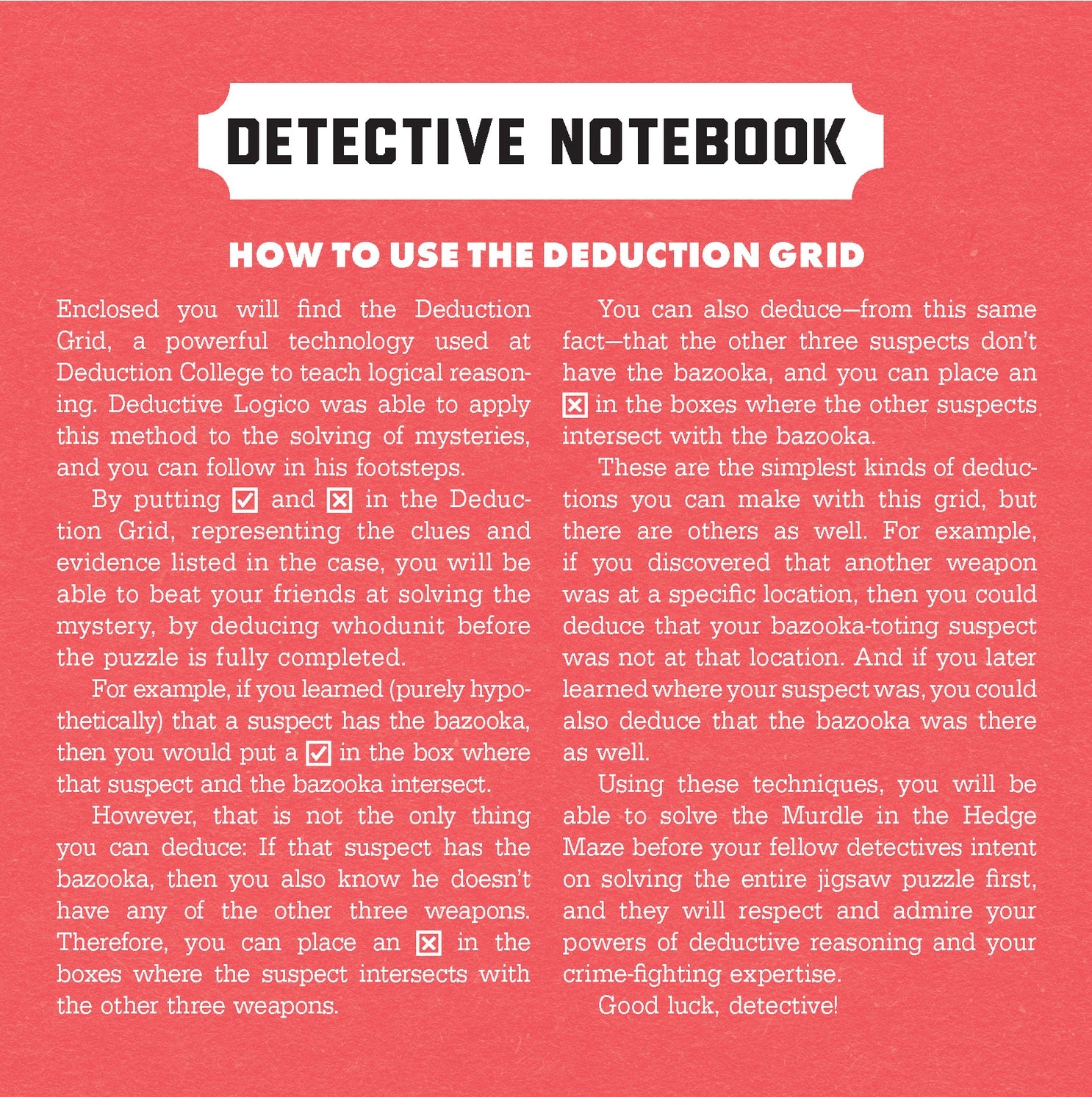 Shrug on your trench coat and put on your best thinking cap because this all-new form of Murdle mystery includes a logic puzzle, a jigsaw puzzle, and a surprise maze.