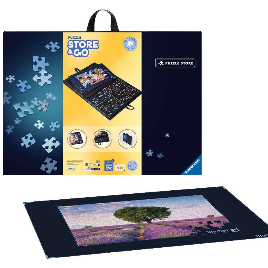 Easily sort pieces within the five integrated trays then build your puzzle on the included puzzle base - it will easily fit 500 and 1000 piece puzzles. For convenient storage and transport of your puzzle, simply place the puzzle base on the sorting trays and snap the lid closed. Your loose pieces will stay in their compartments and your in-progress puzzle stays in place - even when upright!