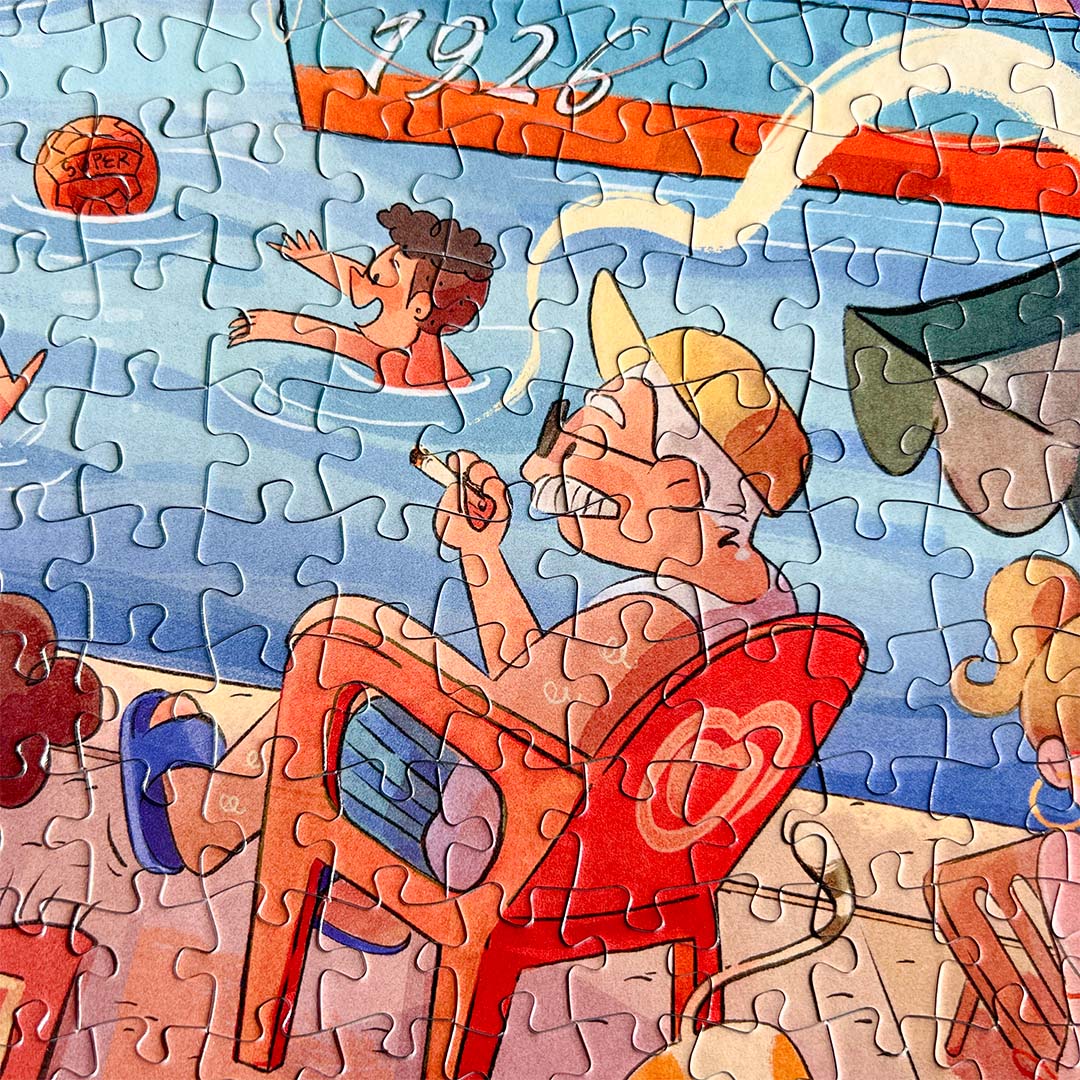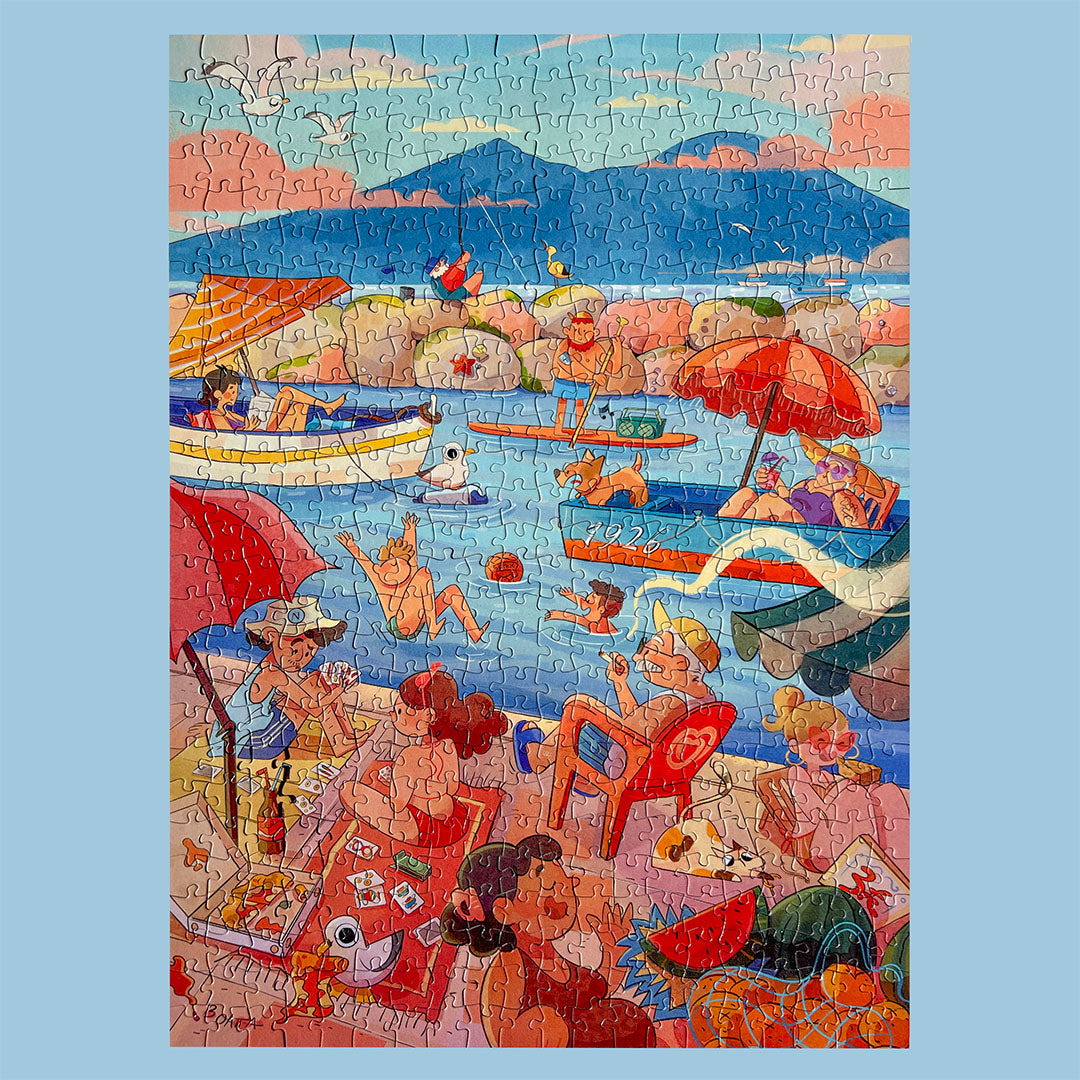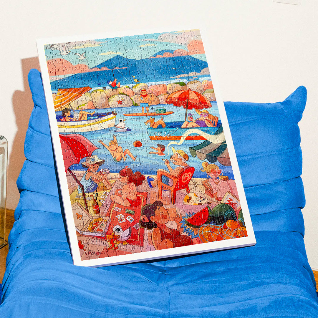 Naples is a 500-piece puzzle that captures the Mergellina area, one of the most famous areas of the Chiaia district, where the sea meets street life. In the illustration, Naples is immediately recognizable by its everyday symbols: the old man in a white tank top, the fruit market, the children playing and diving into the sea, and the small boats bobbing on the shores. The palette of this illustration is "postcard-like," with a cool marine base balanced by very Mediterranean warm accents.