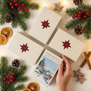 The Cloudberries 12 Mini Puzzles of Christmas gift box includes twelve small boxes, each with an 80-piece festive puzzle and a red star design. Three holiday-themed puzzles are shown, set against a snowflake-patterned background.