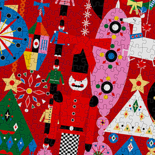 The Yuletide | 1,000 Piece Jigsaw Puzzle by Cloudberries comes in a square box with Santa, ornaments, trees, nutcracker soldiers, and stars on a red background. The spine reads YULETIDEโ€”perfect for festive holiday puzzling!.