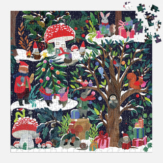 Galisonโ€™s Yuletide Forest | 500 Piece Jigsaw Puzzle showcases an illustrated forest with animals, gnomes, gifts, a decorated tree, and mushroomsโ€”perfect for the holidays.