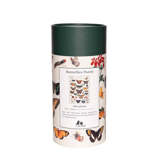 A cylindrical container from 123 Farm, decorated with butterfly and flower designs, contains the Butterflies | 500 Piece Jigsaw Puzzle inside.