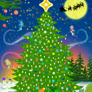 Enjoy holiday fun with the Christmas Magic | 500 Piece Jigsaw Puzzle by Mimsybird Puzzles—featuring a festive Christmas tree, gifts, animals, and decorations under a starry night sky.