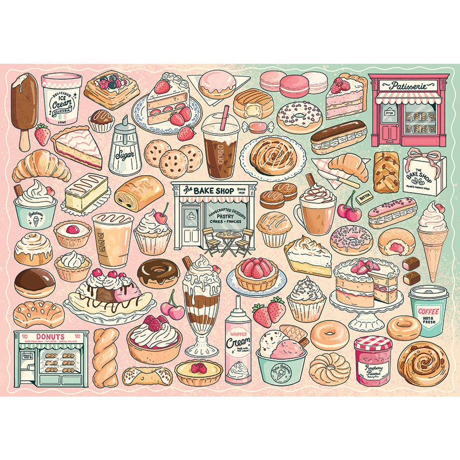 Go ahead, indulge in a calorie-free celebration of sweetness with Treat Yourself, a 500 piece jigsaw puzzle illustrated by Scottish artist Eve Anderson! This charming pink collage captures the whimsy of a patisserie, boulangerie, and bake shop all rolled into one complete with donuts, éclairs, cupcakes, and creamy milkshakes on a delightful gradient background. Crafted with random cut pieces for a unique fit and printed on linen paper to reduce glare, this Cobble Hill puzzle is a treat for the eyes and a feast for the imagination.