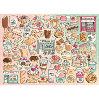 Treat Yourself is a 500 piece jigsaw puzzle by Cobble Hill, showcasing illustrated bakery treats and pastel shop signs—ideal for patisserie puzzle fans.
