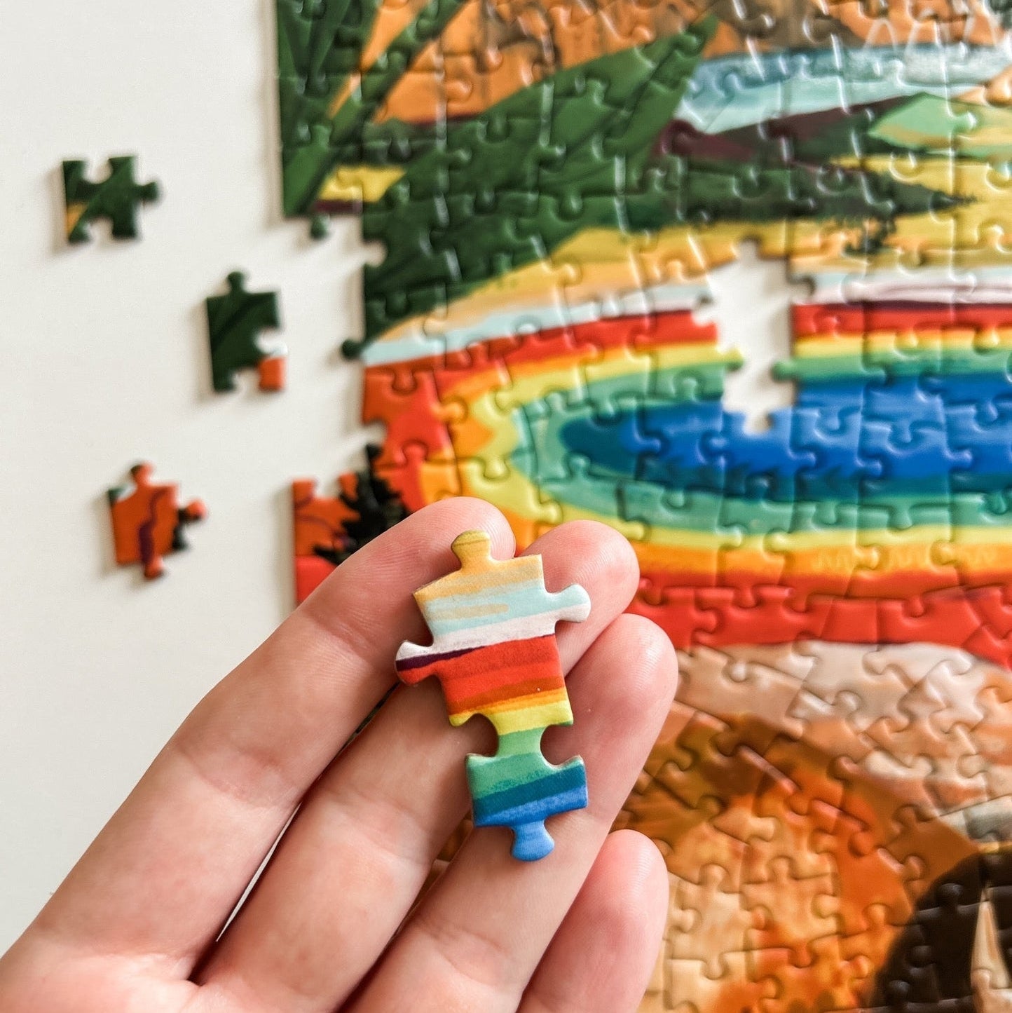 This 1,000 pc puzzle features a collage of iconic scenes of Yellowstone National Park. Mammoth Hot Springs, Grand Prismatic Spring, the Lamar Valley, Old Faithful, and the Grand Canyon of Yellowstone each have their moment to shine in this fun, modern, artistic puzzle.