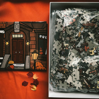 Spooky Street | 1,024 Piece Jigsaw Puzzle by Little Spooky Studio features illustrated houses with Halloween decor, ghosts, and autumn leavesโ€”perfect for cozy fall nights.