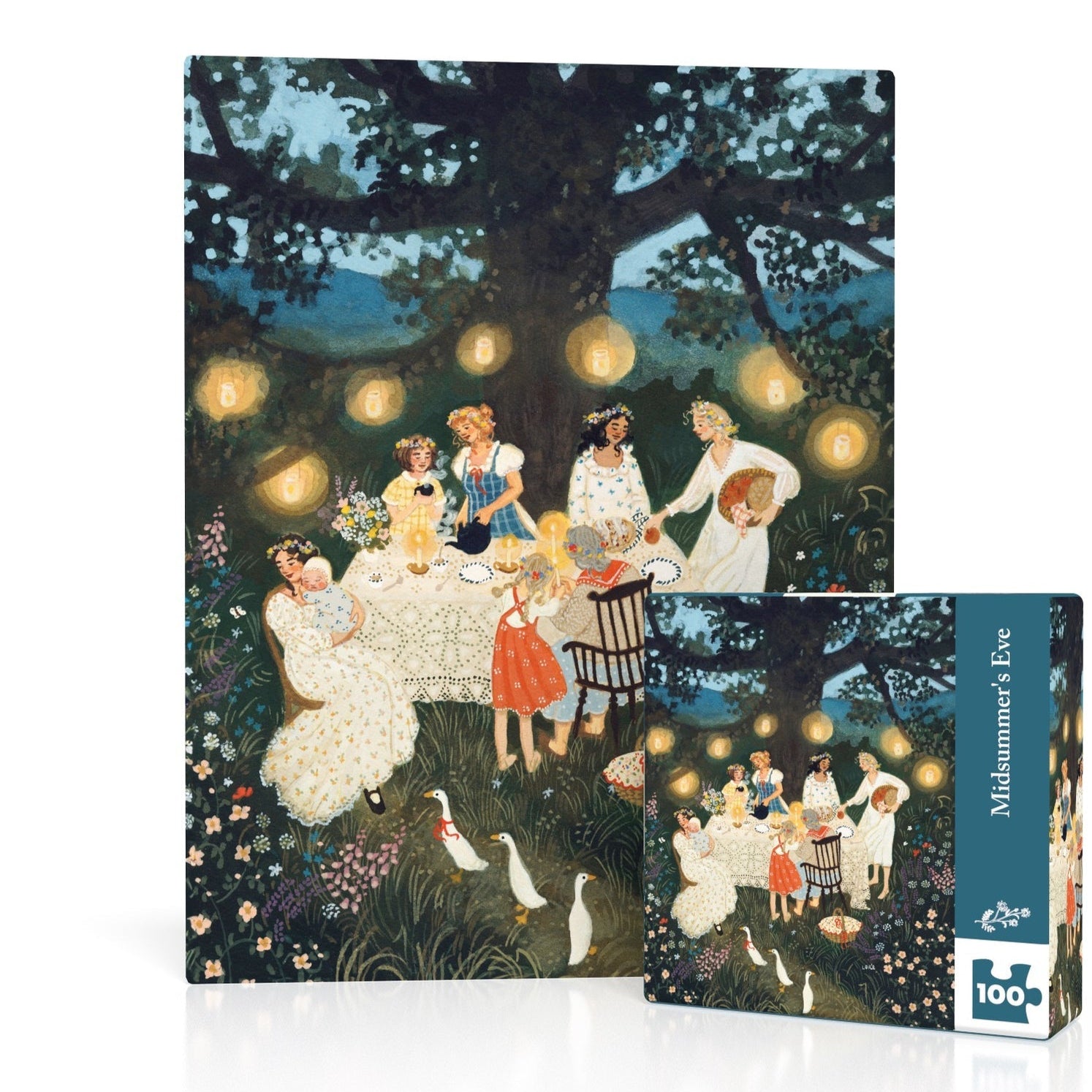 Step into a dreamy summer evening with the enchanting "Midsummer's Eve" Mini Puzzle, illustrated by artist Loré Pemberton. This beautifully detailed puzzle captures the essence of a festive outdoor gathering beneath a grand tree adorned with glowing lanterns. Women and children, dressed in whimsical summer attire and flower crowns, share a joyful moment around a candlelit table, surrounded by lush greenery and curious geese. The serene atmosphere and intricate artwork make this puzzle both a delightful challenge and a feast for the eyes.
