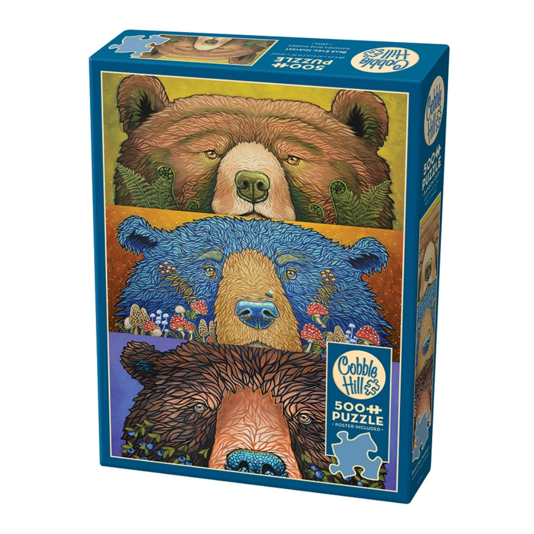 Alaskan artist Amanda Rose Warren enjoys recording the flora and fauna of Alaska in vivid colors with whimsical touches. Amanda has her own gallery space in Anchorage and offers prints, stickers, bags, original paintings, and now puzzles! Bear Eyes: Harvest is a fun trio of furry faces that stare at you with pensive, questionable, and thoughtful eyes.