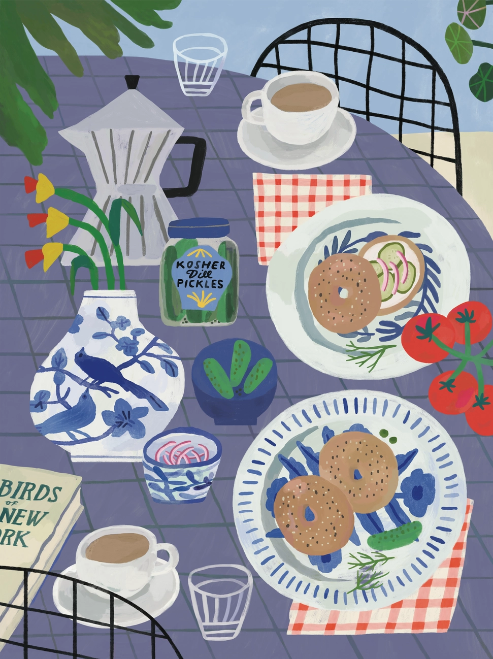 Bagels, pickles, and morning light — Half-Sour Sundays celebrates the quiet ritual of a New York breakfast. From the blue-and-white china to the checkered napkins, every detail feels familiar yet elevated — a love letter to slow starts and good coffee. Each 1,000-piece puzzle comes beautifully packaged in our signature book-style box with a cotton zipper pouch stamped with the QP logo and tagline “not quite put together.” Thoughtfully designed for your coffee table or bookshelf, it’s art you can piece together. Half-Sour Sundays was Illustrated by Lucinda Schreiber.