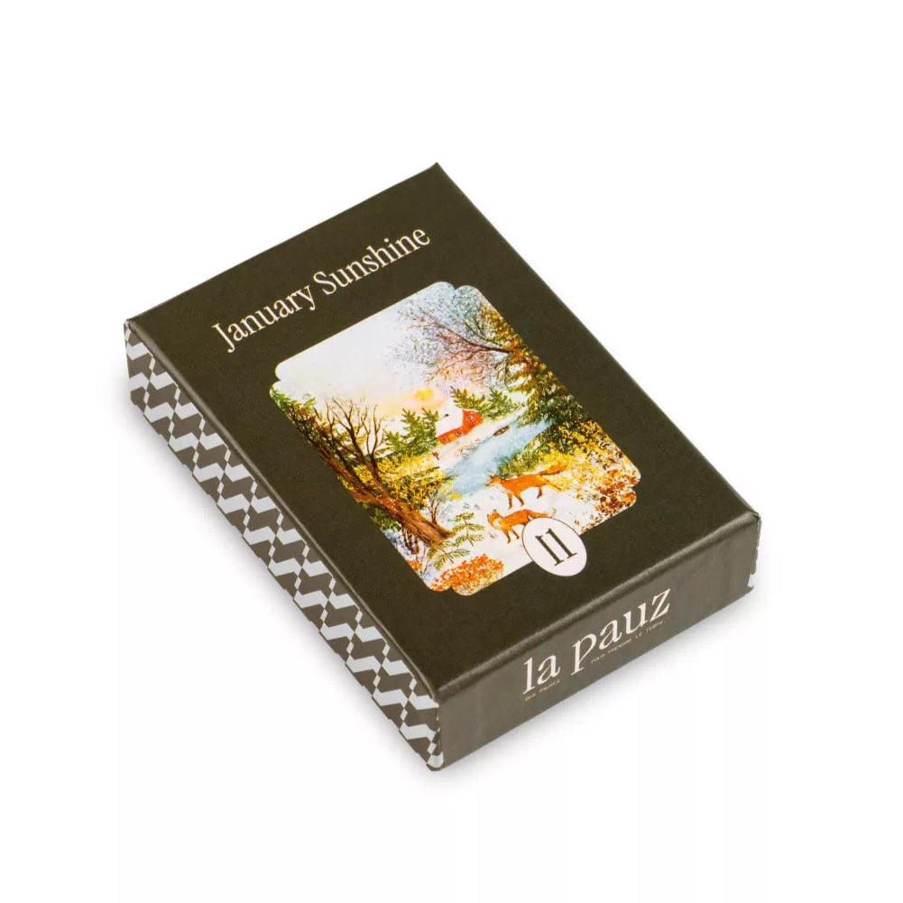 The January Sunshine mini puzzle by La Pauz is a mini puzzle consisting of 99 pieces. It is illustrated by Laivi Poder. Enjoy a gentle day in this enchanting landscape, where winter snow blends with the light of a brilliant sun. Majestic foxes, a frozen lake, and seasonal flowers enhance this peaceful scene.