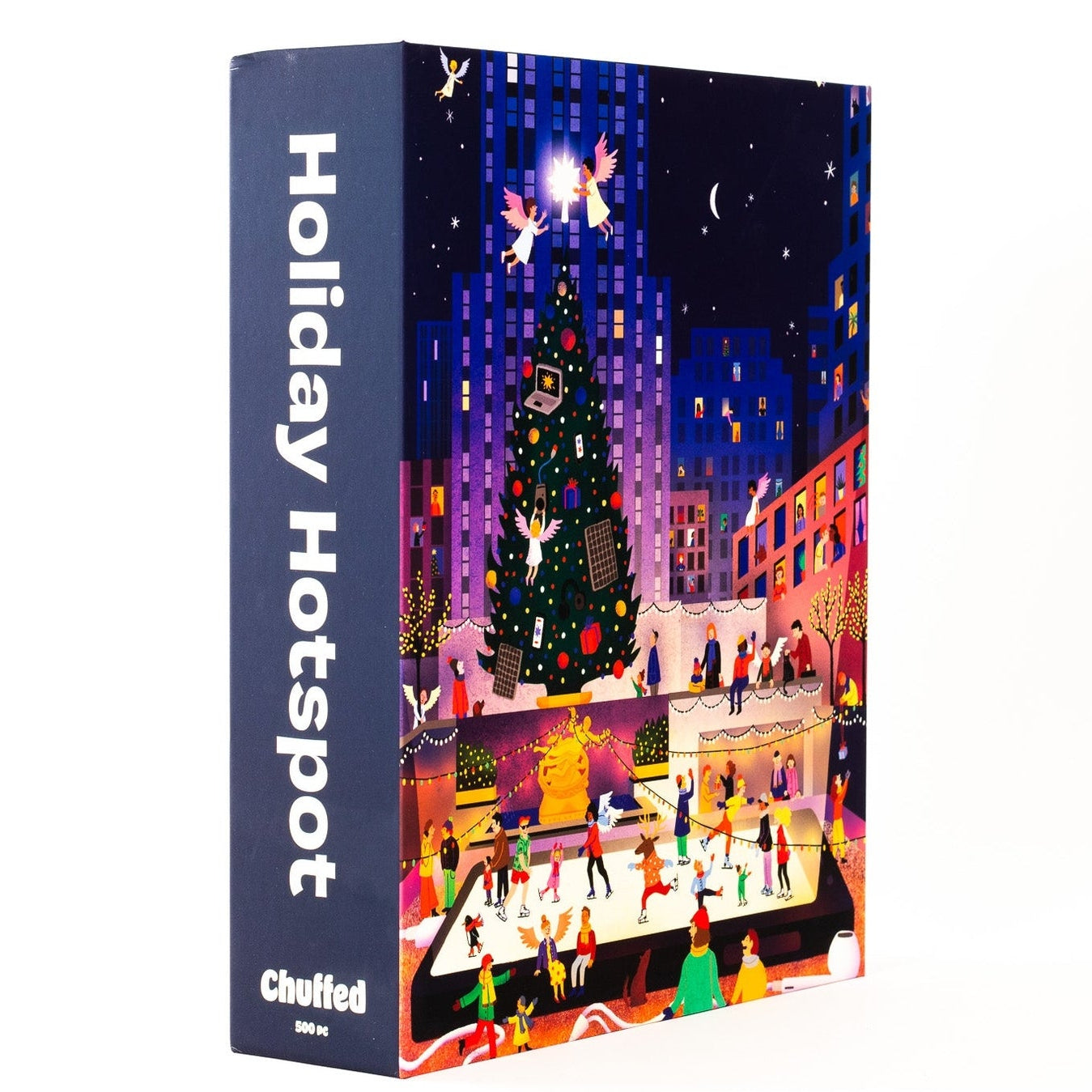 This vibrant, 500-piece Christmas jigsaw puzzle features a lively winter city scene with a playful modern twist — the skaters are gliding across a giant glowing cell phone. The artwork blends classic holiday charm with contemporary humor, showing families and friends twirling under a towering Christmas tree as the illuminated “screen” beneath them lights the square. Bright city buildings, festive decorations, and the unexpected digital rink create a unique holiday puzzle that’s perfect for winter nights, cozy gatherings, and anyone who loves whimsical Christmas artwork with a clever surprise.