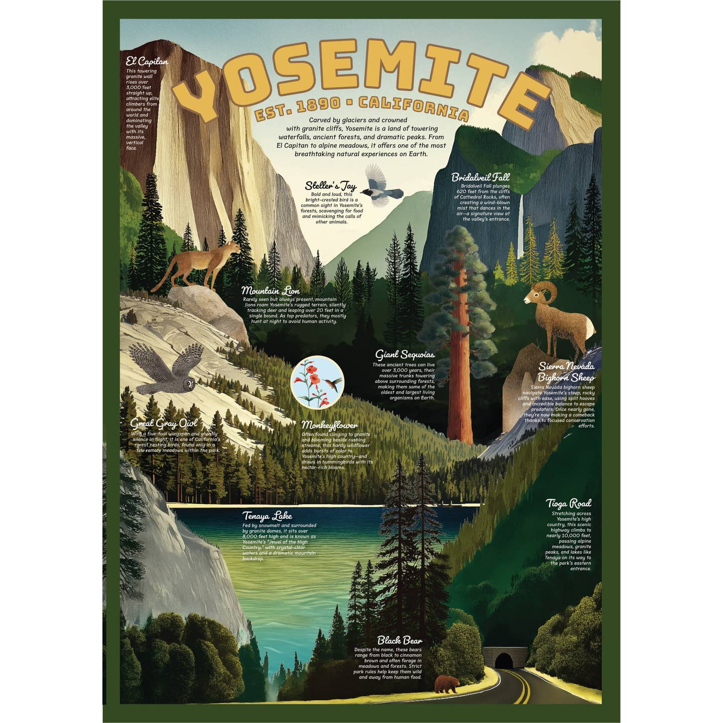Enjoy assembling this beautiful 500 piece puzzle, designed with illustrations featuring iconic species and scenic wonders of Yosemite National Park.