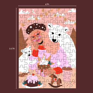 The Polar Bear | 99 Piece Jigsaw Puzzle by Puzzledly features an illustrated woman with pink hair and glasses, two polar bears, desserts, and festive decor. This pocket-sized puzzle has ribbon-cut pieces and "Polar Bear" on the box.