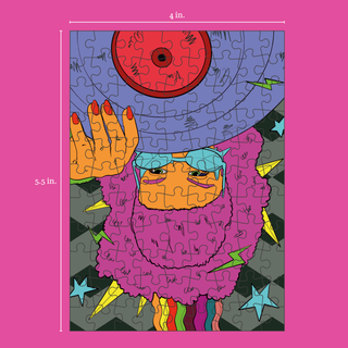 The Puzzledly Vinyl | 99 Piece Jigsaw Puzzle is a pocket-sized box featuring vibrant art of a purple-haired person holding a vinyl record, surrounded by stars and lightning bolts.