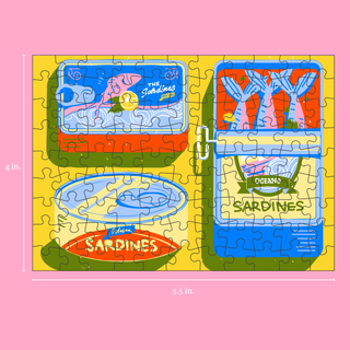 Puzzledly’s Sardines | 99 Piece Jigsaw Puzzle comes in a pink box with illustrations of four opened sardine cans showing fish. This pocket-sized puzzle is perfect for on-the-go fun.