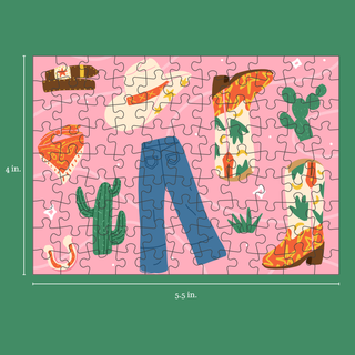 Puzzledly’s Cowgirl | 99 Piece Jigsaw Puzzle features a hat, boots, jeans, cacti, a horseshoe, and a bandana on pink—perfect for on-the-go fun.