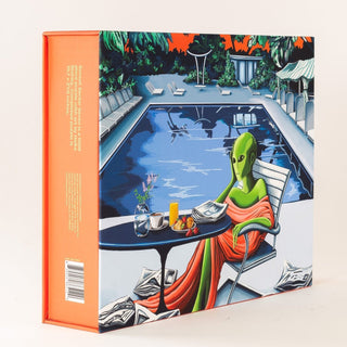 The Sunset Sector Seven 1,000 piece jigsaw puzzle by Chuffed Puzzles features surreal art by Heike Blakley of a green alien relaxing poolside with snacks; completed puzzle shown with pieces and cucumber slices in front.
