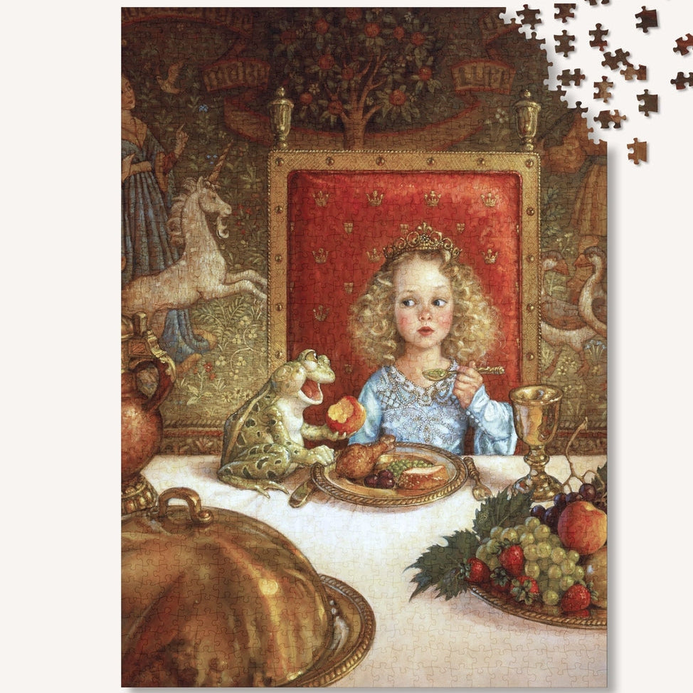 A Royal Dinner with the Frog Prince: Immerse yourself in the timeless fairy tale of The Frog Prince with this beautifully detailed puzzle, illustrated by Scott Gustafson. The scene depicts the pivotal moment where the frog joins the princess for a royal dinner, a key part of the story's unfolding magic. Rich with medieval charm, from the grand tapestry behind them to the lavish feast on the table, each piece of this puzzle invites you to dive deeper into the enchanting world of promises, transformation, and true love.