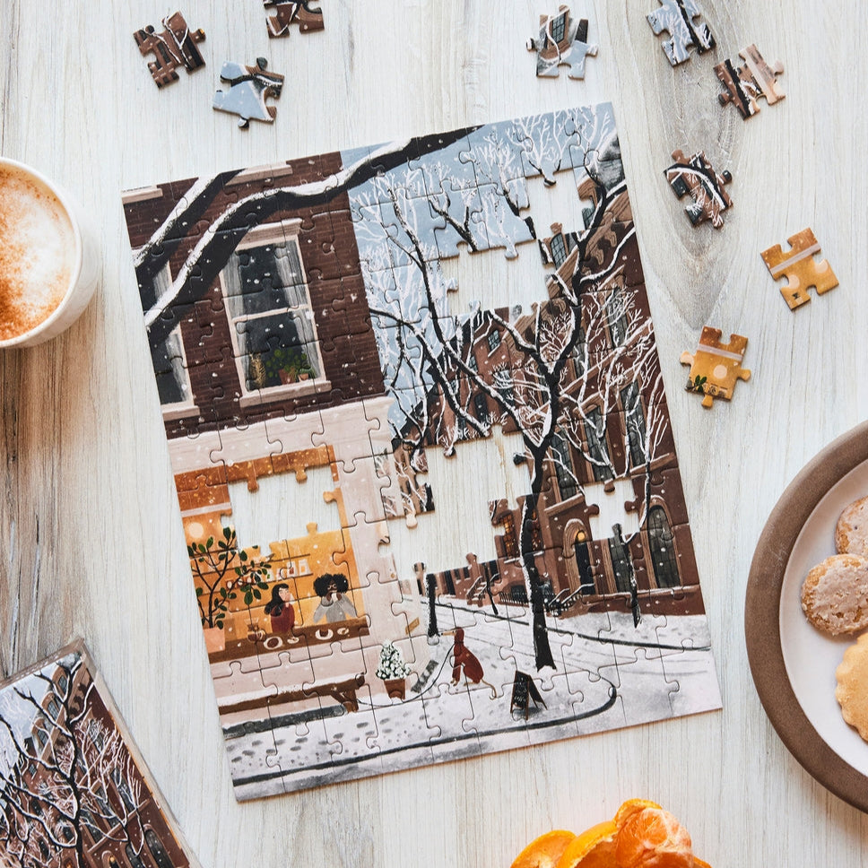 Escape to a cozy West Village coffee shop on a snowy New York day with this delightful 100-piece puzzle by Rachel Victoria Hillis. Snow in the West Village captures that perfect moment of warmth and relief when you step inside from the freezing cold—whether you're catching up with friends or enjoying a quiet solo coffee break. The scene includes a sweet detail: a patient dog waiting outside while his owner grabs coffee to go for their upcoming winter walk in Central Park. This snack-sized puzzle is perfect for a quick dose of urban winter charm.