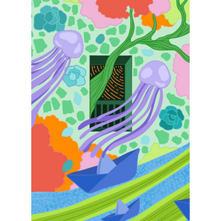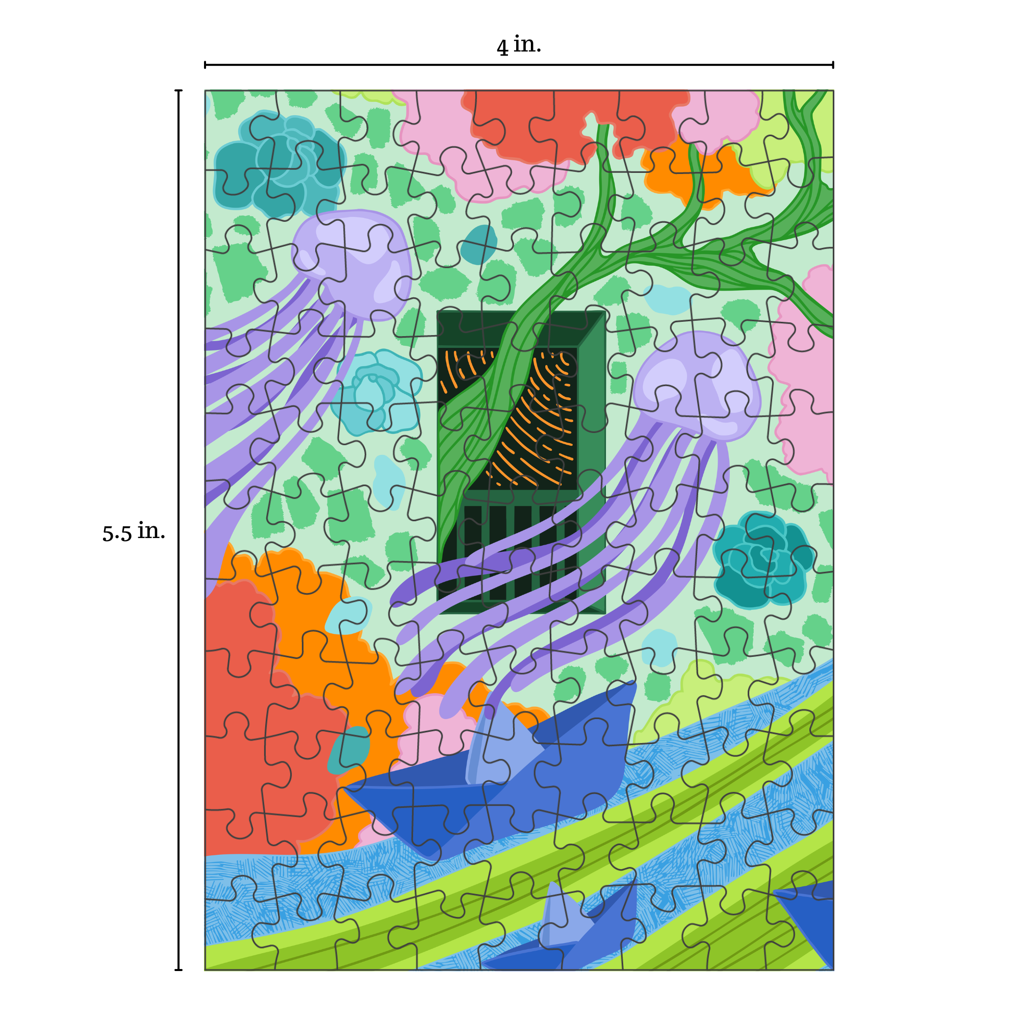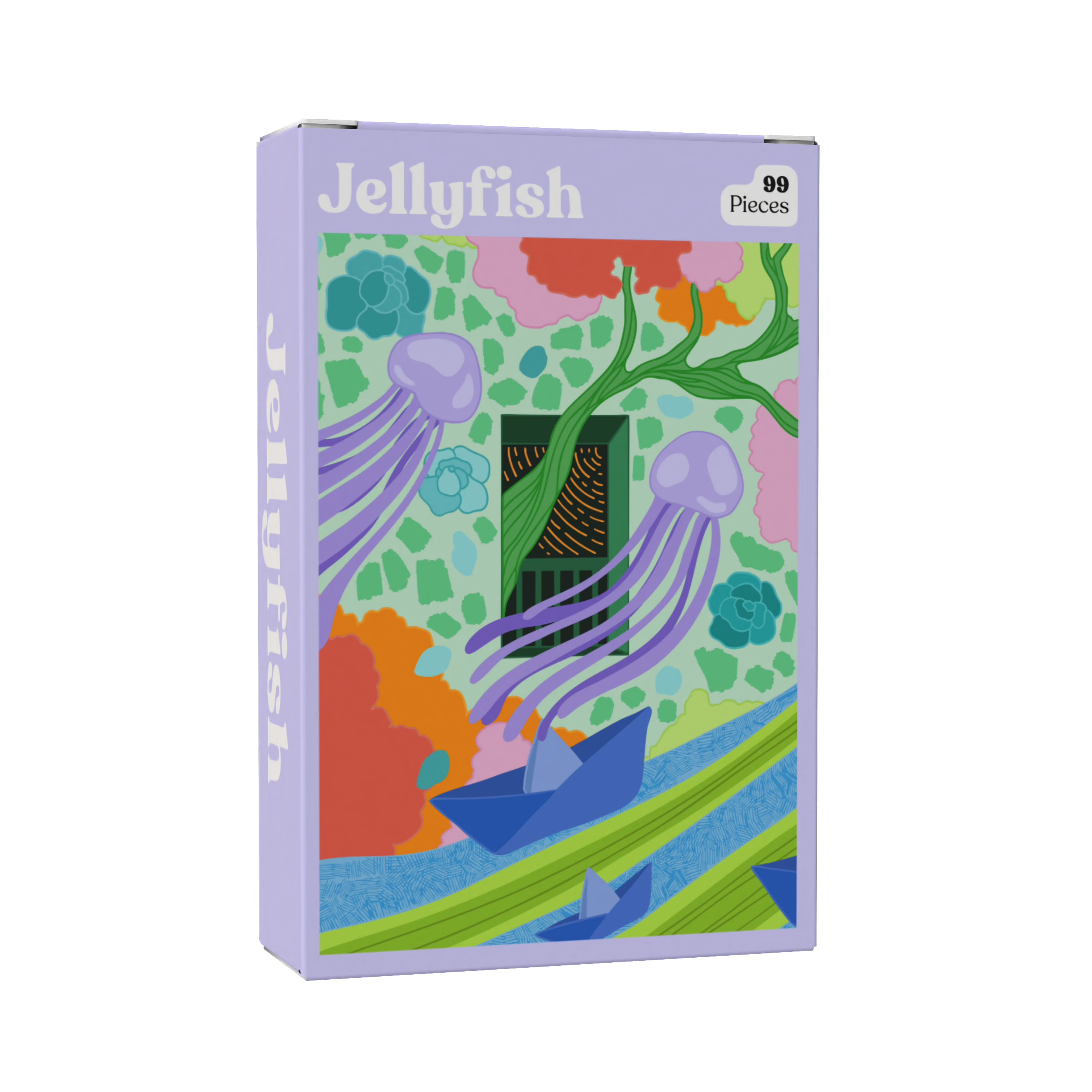 Set sail into a dreamlike seascape with this 99-piece mini jigsaw—measuring just 4″ × 5.5″ when assembled—featuring ethereal jellyfish drifting over a river of paper boats.