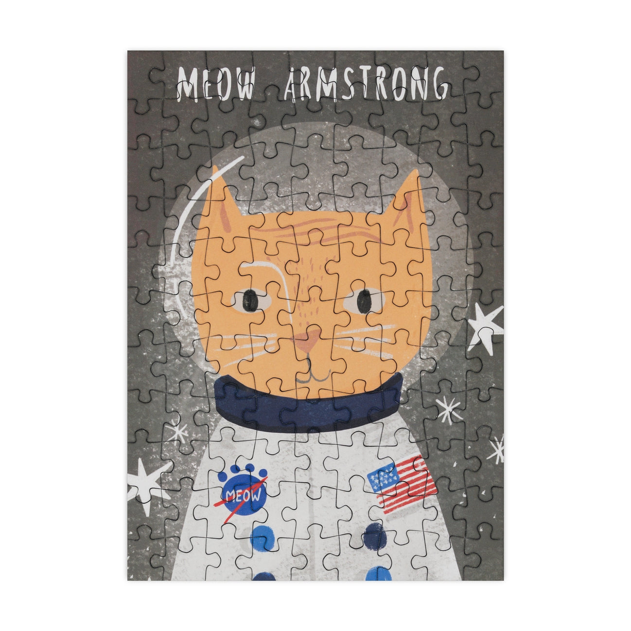 99 Piece Mini Jigsaw Puzzle featuring a fun cat illustration of Neil Armstrong by Nia Gould.