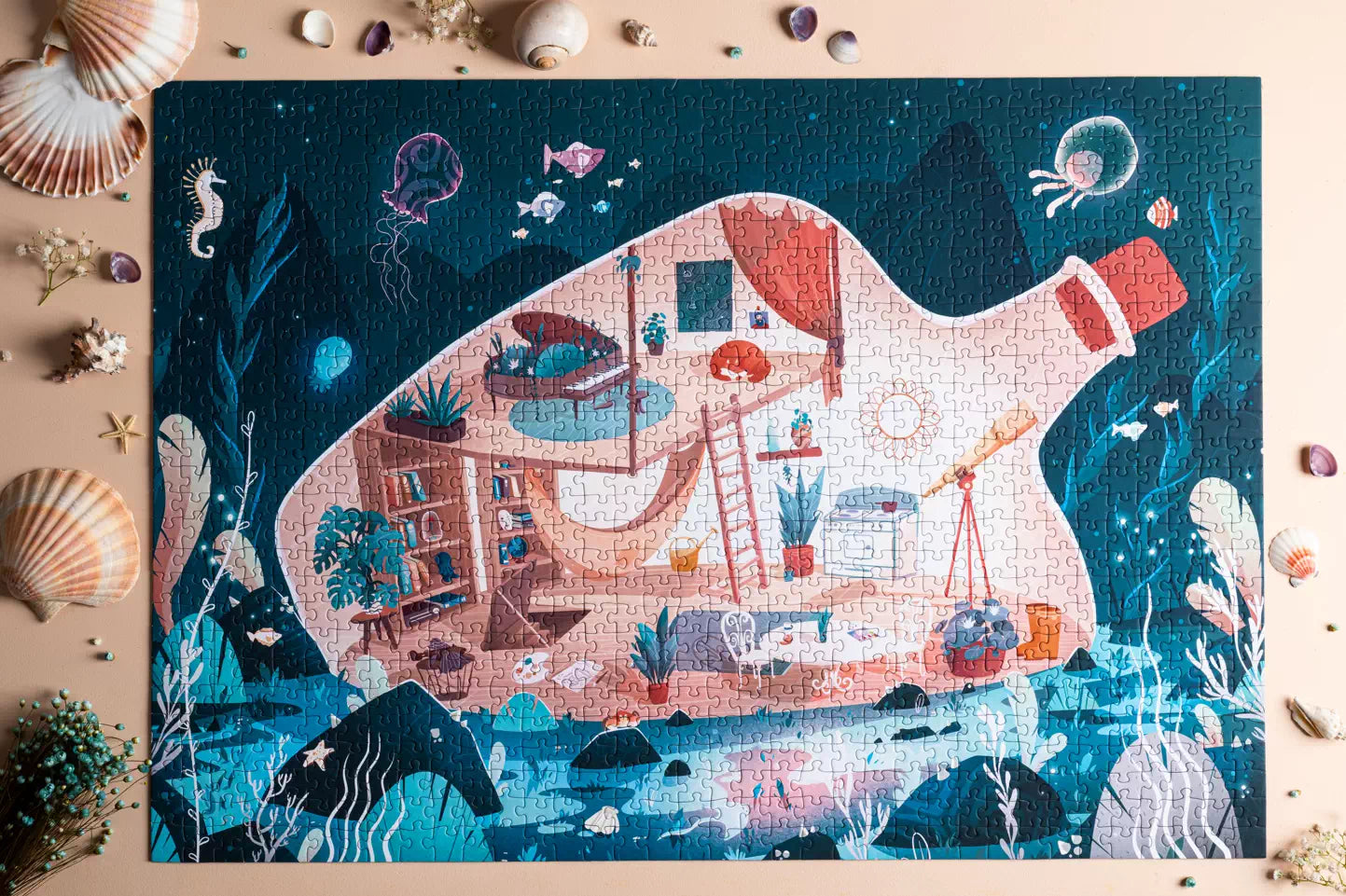 Bulle d'air is a puzzle composed of 1000 pieces from the brand Les Éditions Heol. Illustrated by Eor Glas, a French artist, this puzzle invites you to dive into the seabed. This cocoon surrounded by marine fauna and flora will allow you to have your breath of air during the day.