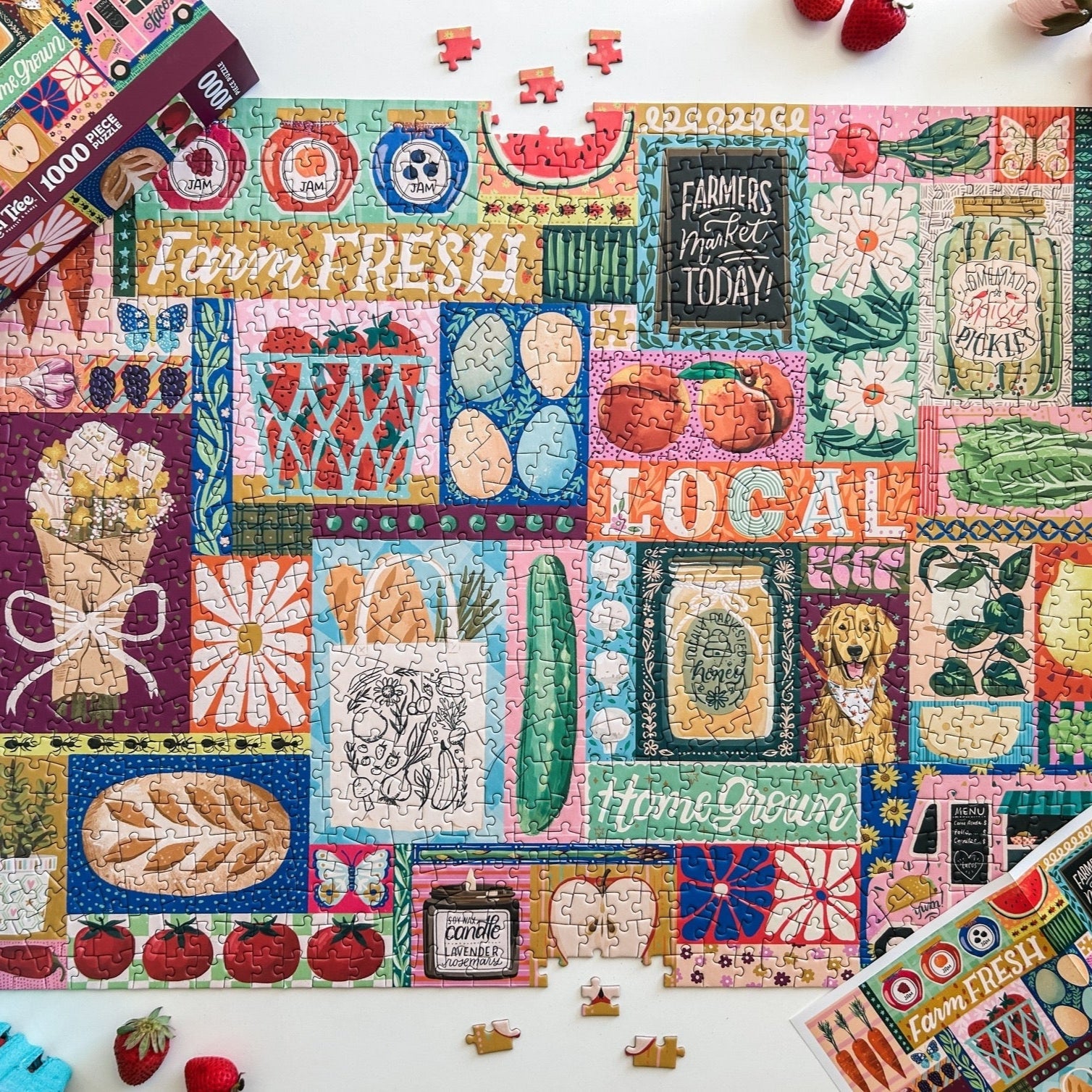 This 1,000 pc puzzle features a patchwork of farmers market-themed art. Feel like you are browsing the stalls of all your favorite farmers market vendors when you piece this one together! We frequently sell our puzzles at farmers markets, and so we loved creating this homage to all the fun and unique sellers that are there each week with us.