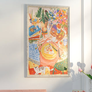 Robotime Leisurely Holiday | 1,000 Piece Jigsaw Puzzle features a vibrant table scene with food, drinks, and art supplies. Ideal for adults. Includes warning: contains small parts.